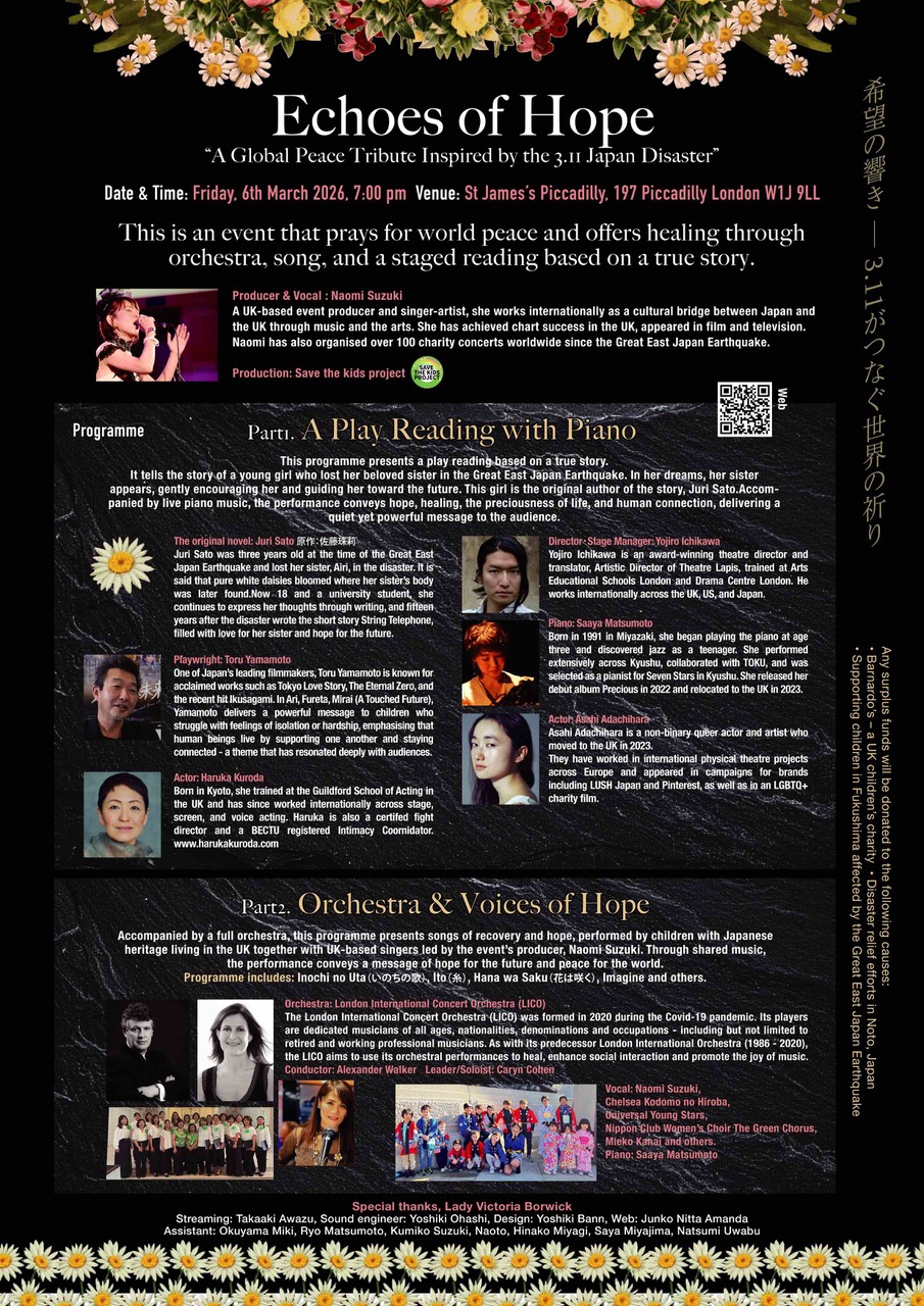 The String Telephone As part of the concert ‘Echoes of Hope’ marking the 15th anniversary of The Great East Japan Earthquake Disaster, Yojiro directed a staged reading ‘The String Telephone’ written by Toru Yamamoto, based on a novella by Juri Sato. 共有: Facebook で共有するにはクリックしてください (新しいウィンドウで開きます) Facebook クリックして X で共有 (新しいウィンドウで開きます) X いいね:いいね 読み込み中…